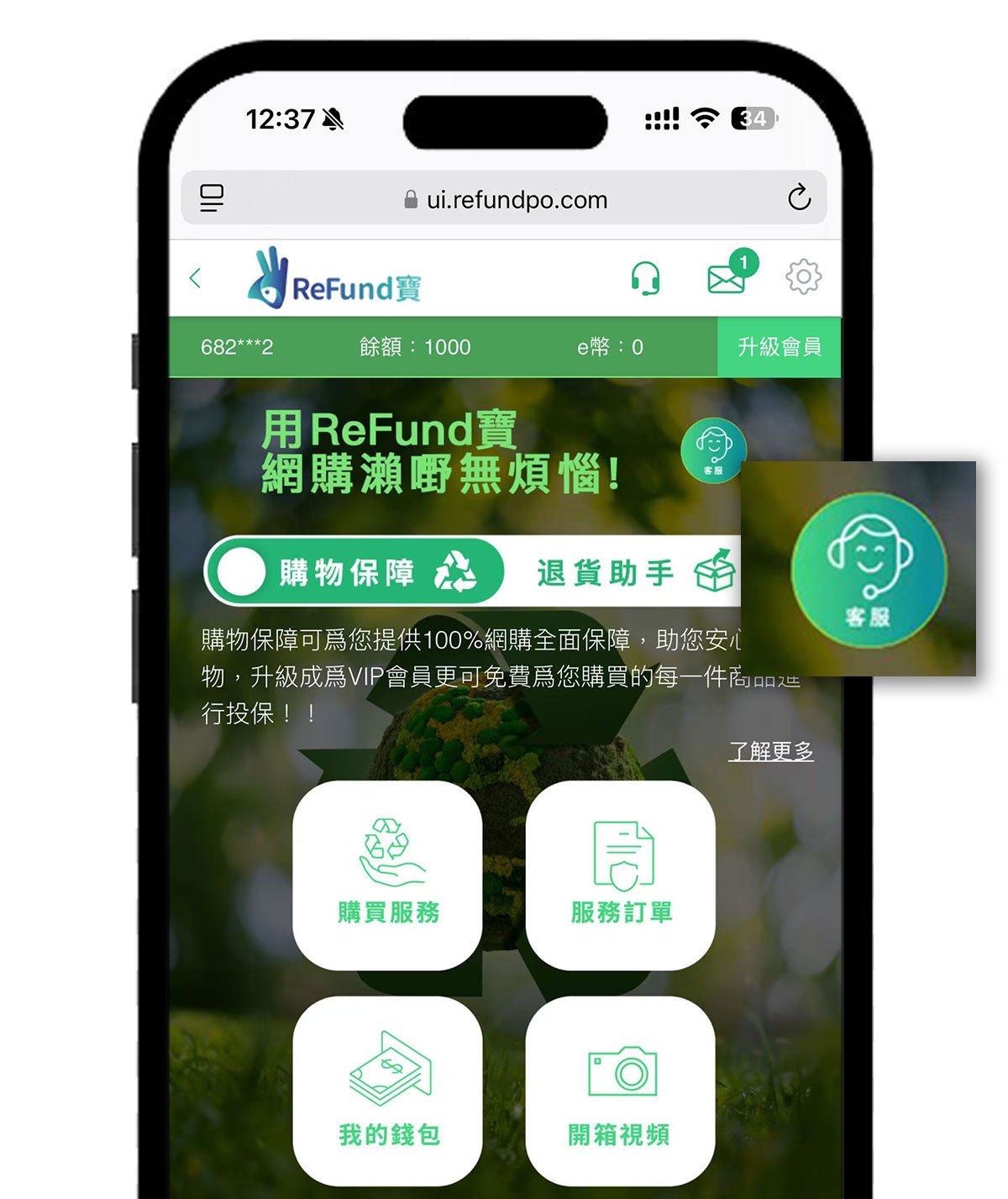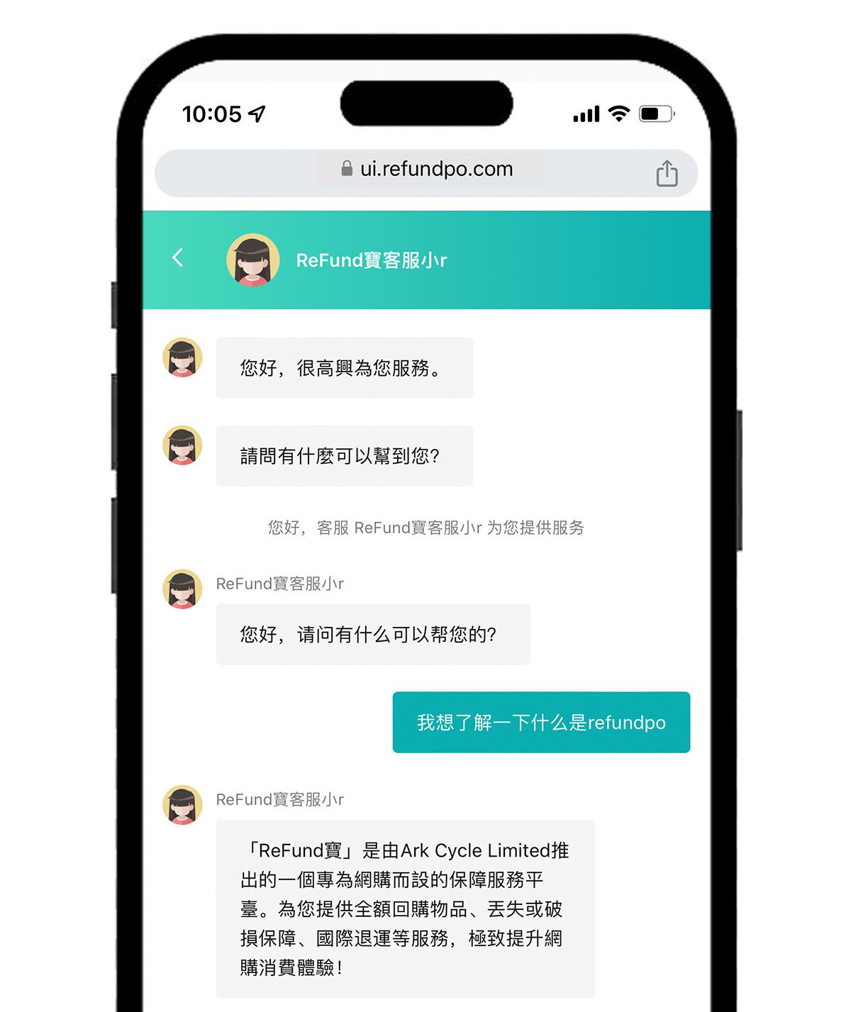 訪問https://ui.refundpo.com ,在首頁右上角 【升級會員】的 下方 有 客服ICON圖標點擊客服 圖標,進入在線客服對話模式