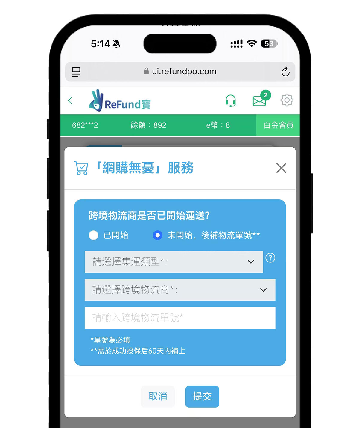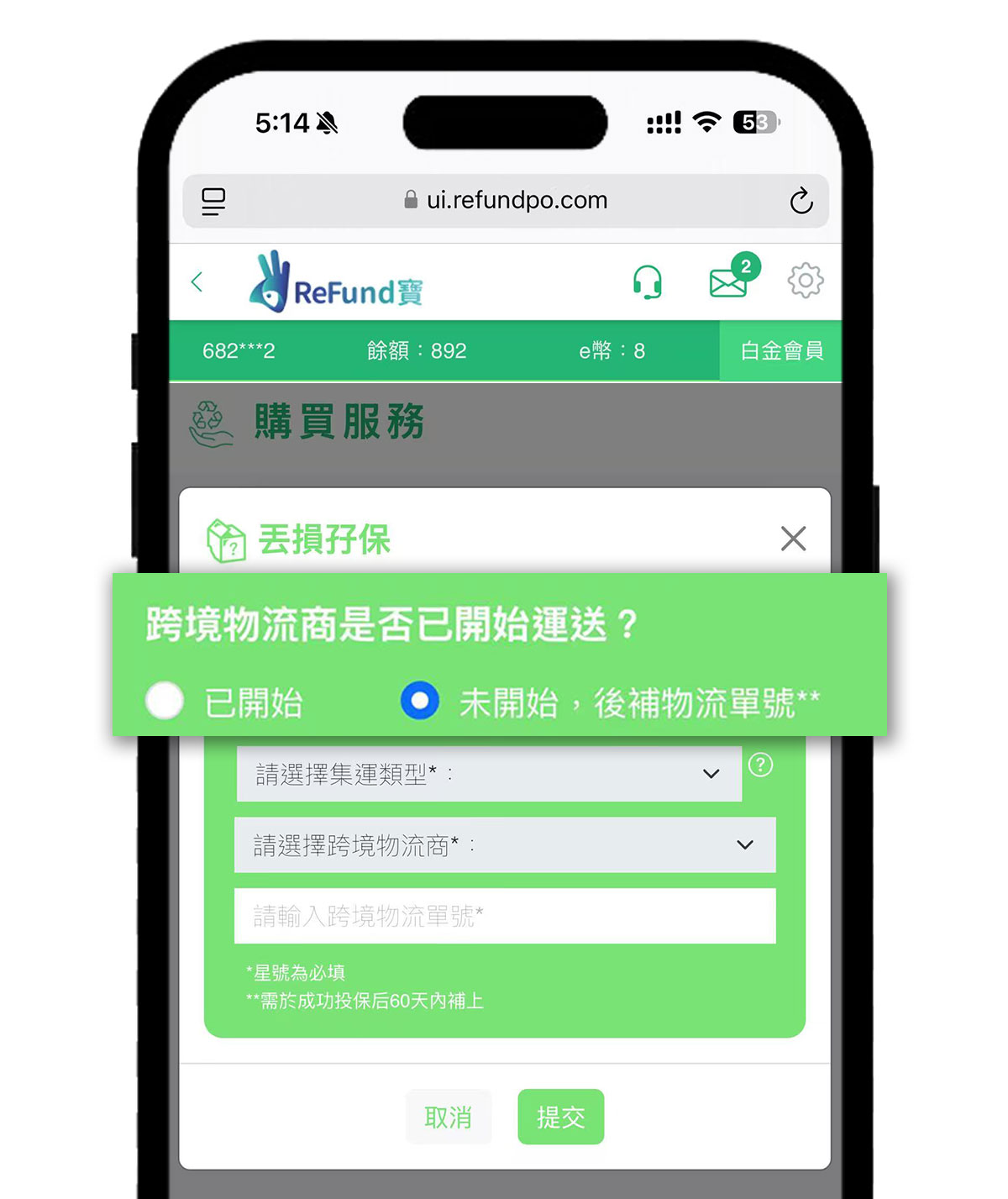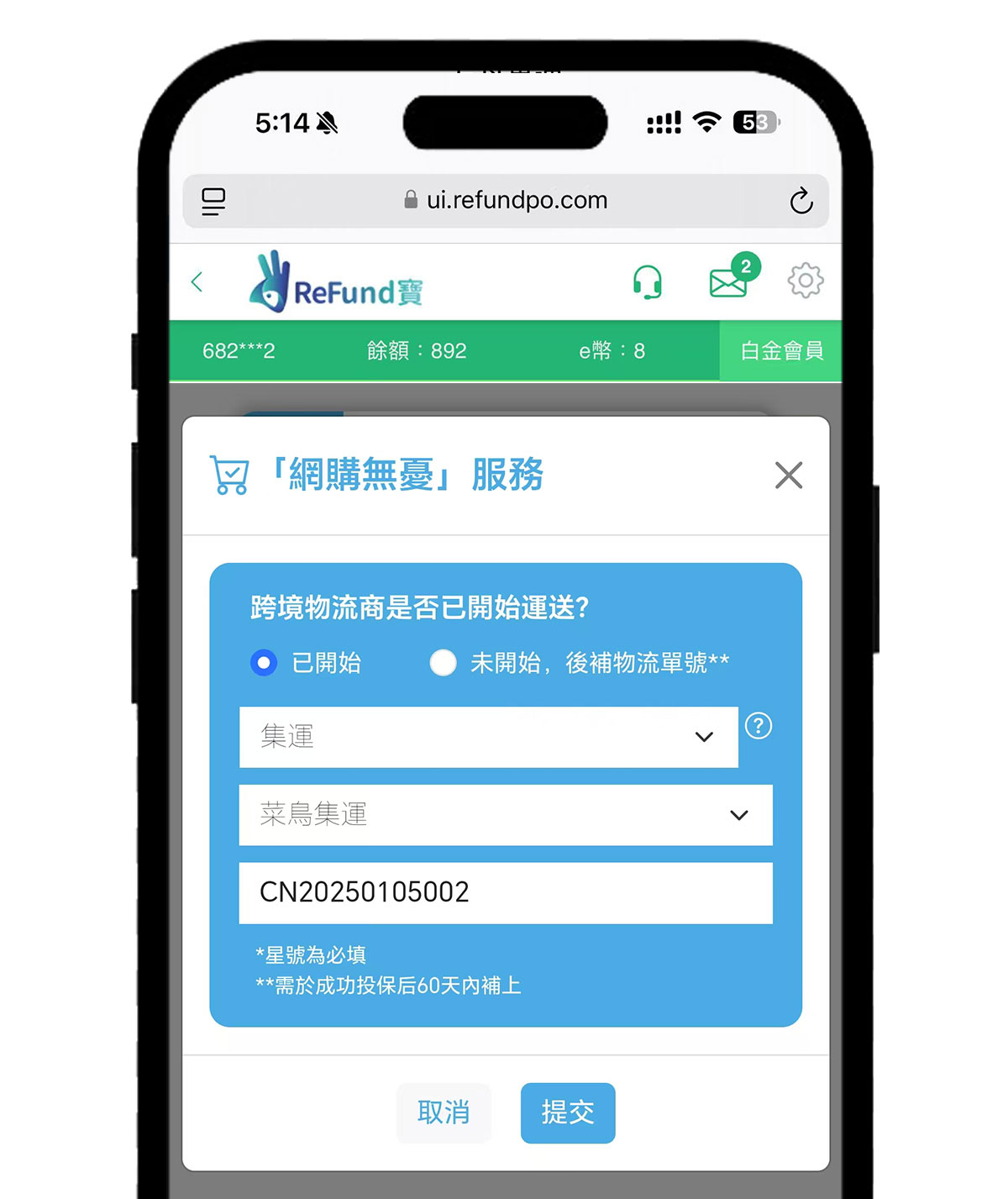 如,還未開始集運或者寄出,請選擇:未開始,後補物流單號。可以先不需要選擇集運類型和跨境物流商。