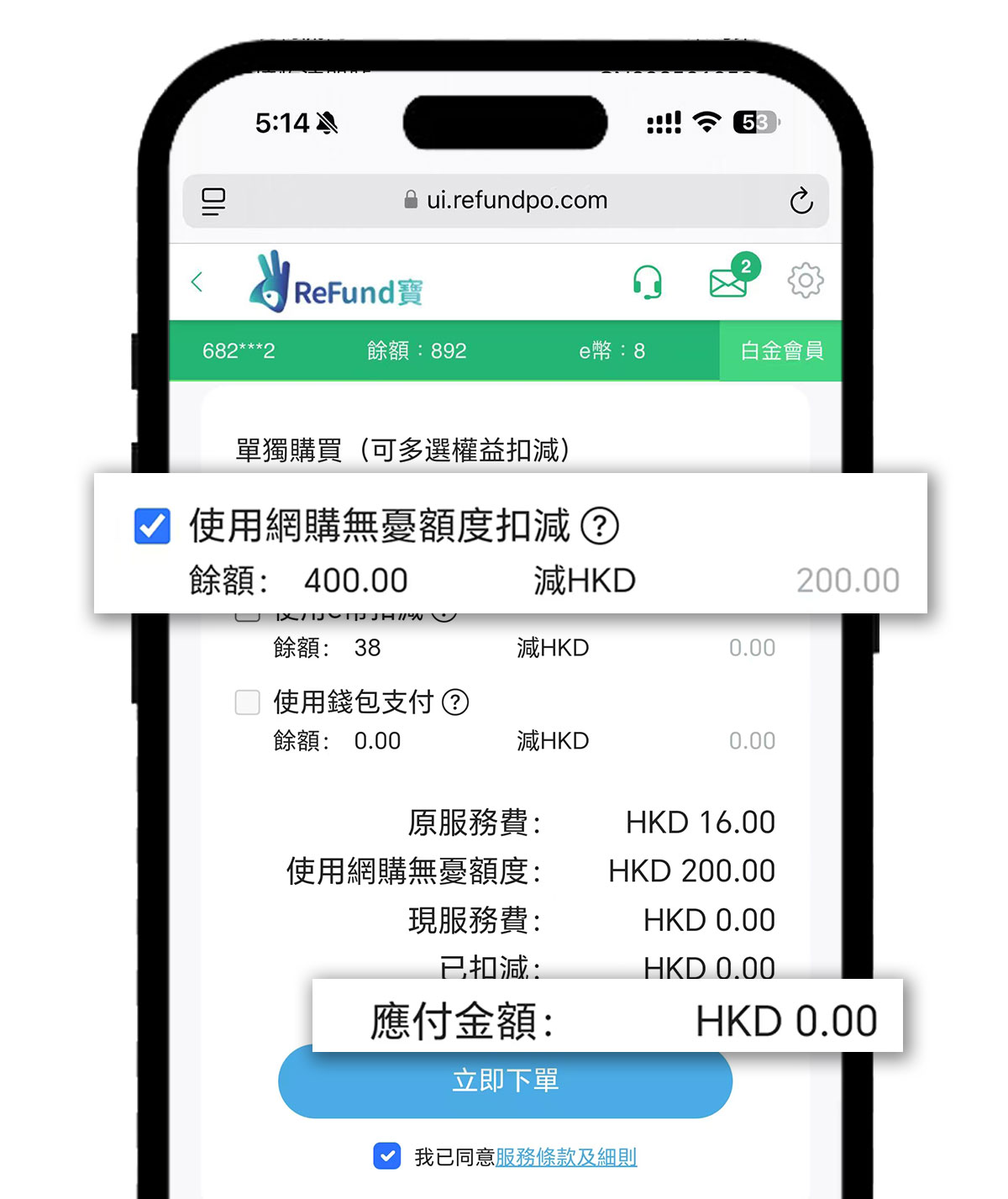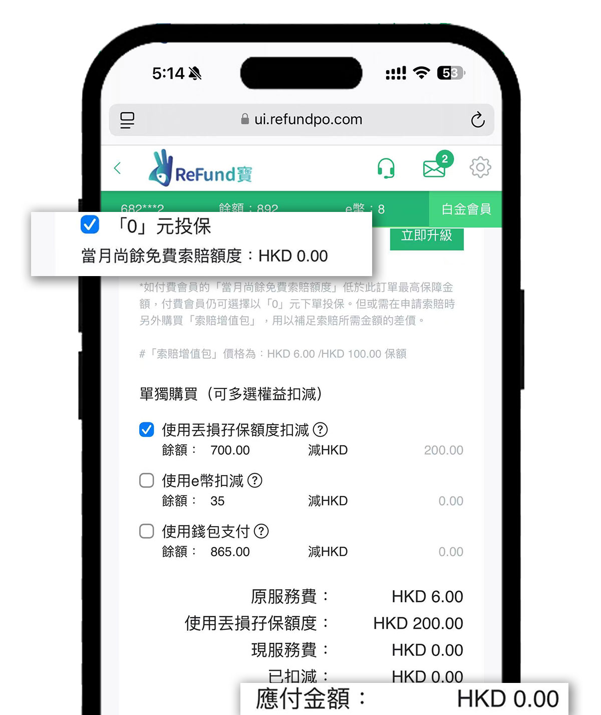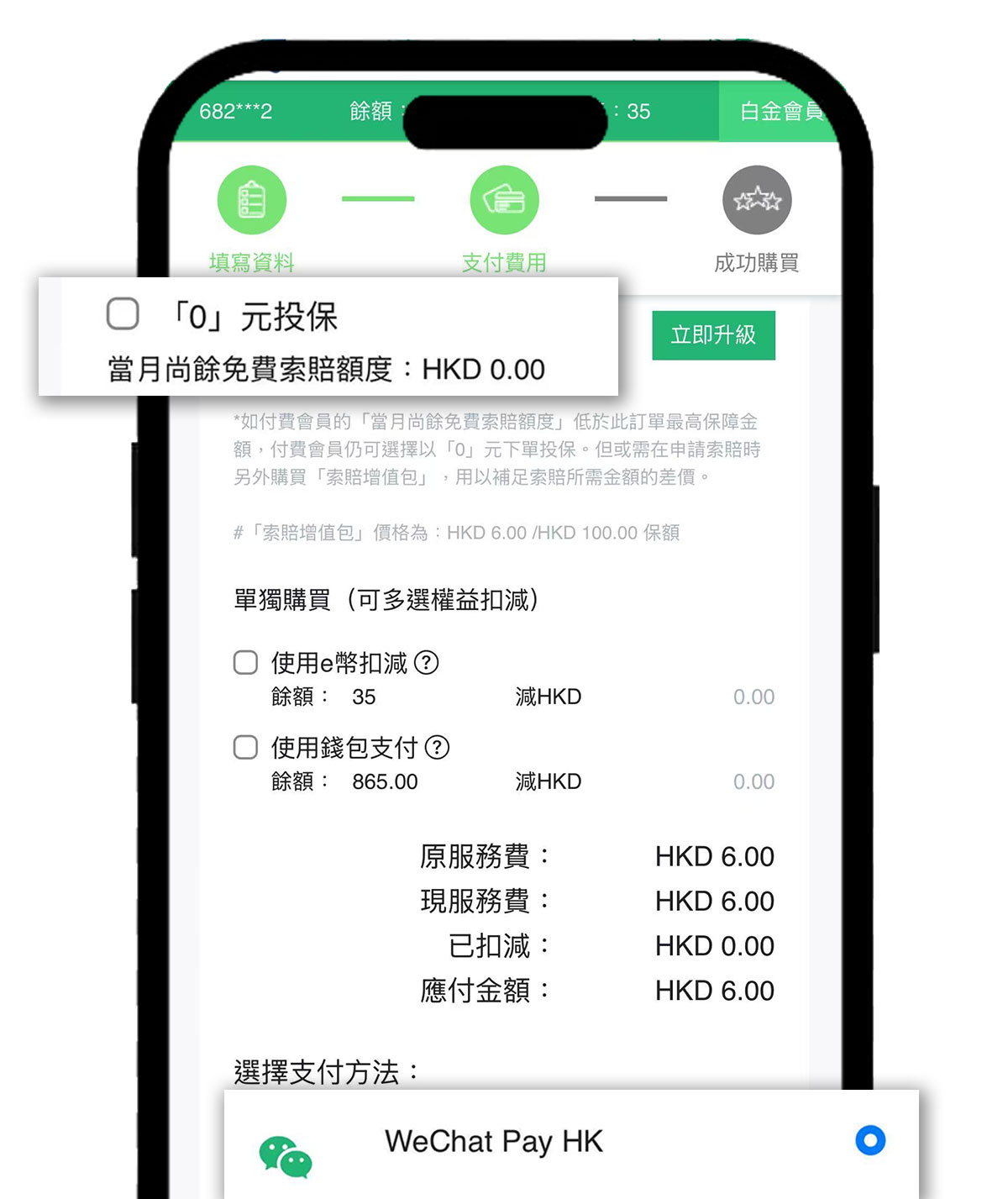 如選擇0元投保,那麼系統可根據當月尚餘免費索賠額度來扣減。無需再使用現金支付,確認無誤後下單。