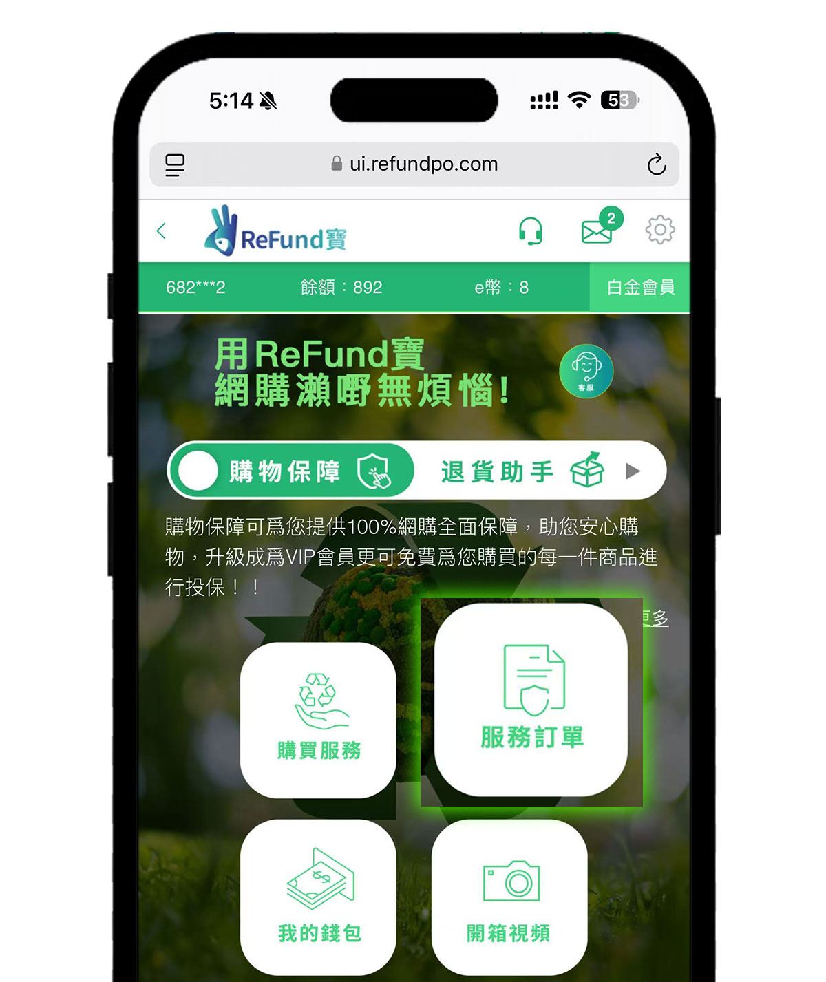 服務訂單 菜單內 展示了【購物保障】和【環保儲物】等所有訂單列表。