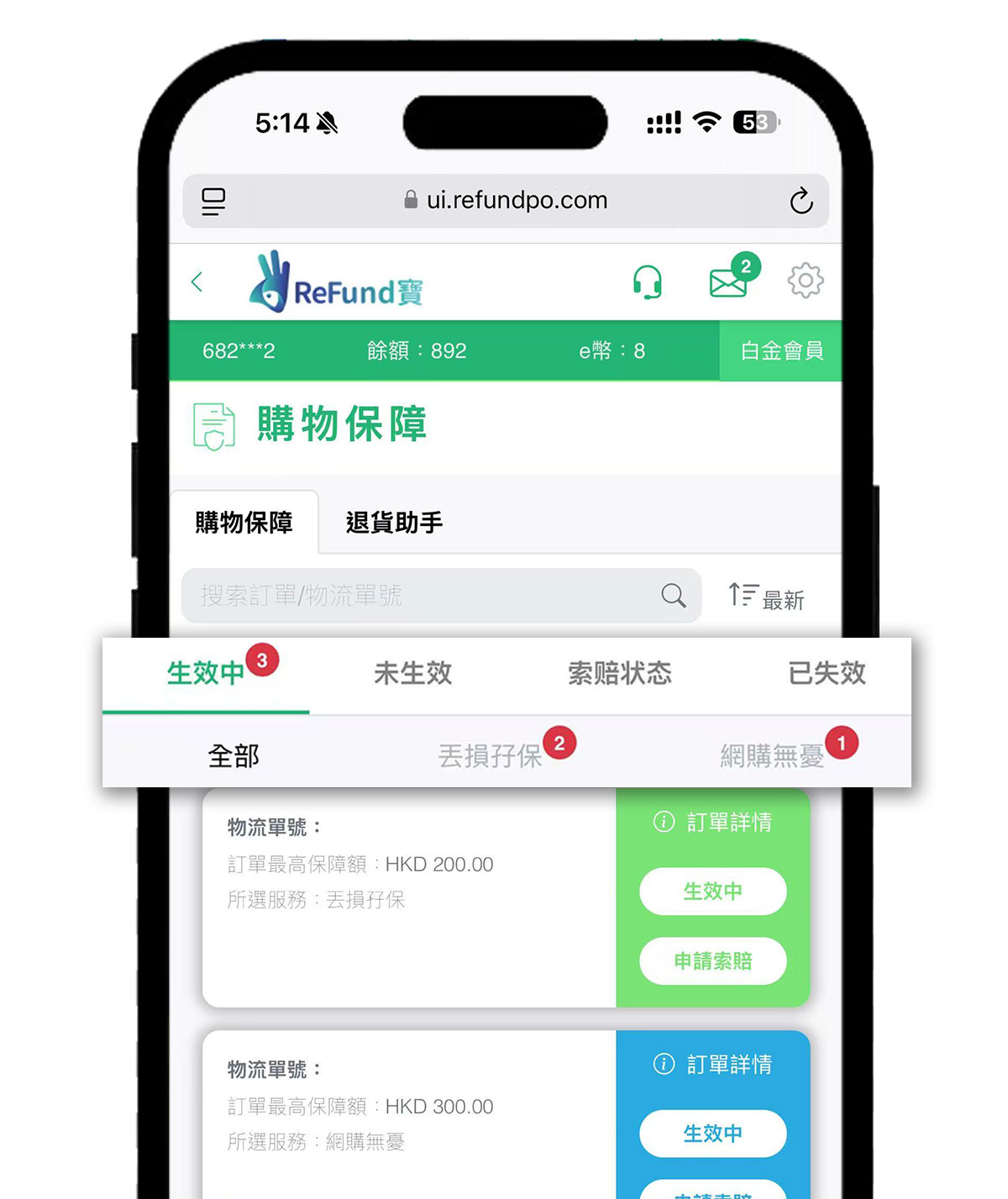 訂單狀態有:生效中、未生效、索賠狀態、已失效 等。